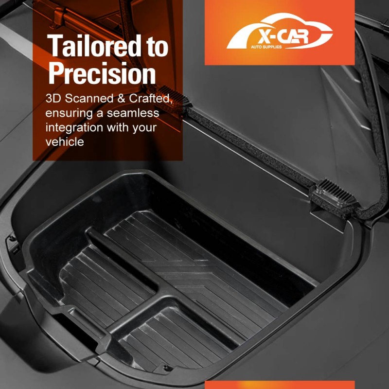 - Function: This all weather front trunk cargo organizer storage tray improves appearance and storage method. Our design intends to keep your organizer storage neat and beautiful, protecting your frunk interior from damage. It can organize your related important stuff, such as emergency equipment, charging adapters, cables, pet/kid toys, tools etc.