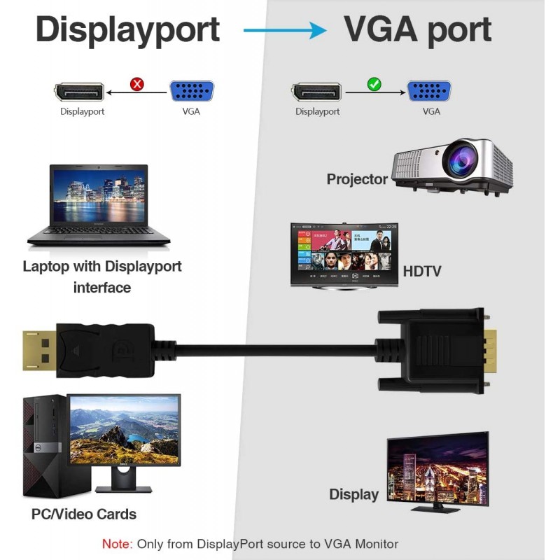 - DisplayPort to VGA cable is a perfect match for your laptop or desktop equipped with DP port. Directly connects DP port from desktop or laptop to a monitor or projector for high-definition video with this DP to VGA converter.
