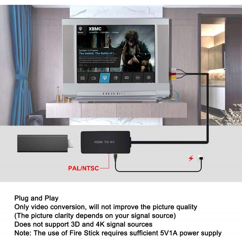 - The HDMI input of the HDMI to AV converter is compatible with most HDMI signal sources, such as HD-DVD, VHS, DVD players, HDTV boxes, HD PVR, HD DVR, HD video recorders, PS3, Xbox 360, Xbox, Fire Stick, Roku, Apple TV, Wii, PC, HD camcorder, etc.