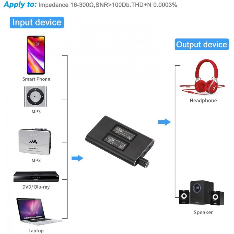 - 16-300Ω Mini HiFi headphone amplifier, It is delicate, compact, lightweight, and portable that it can be carry conveniently.
