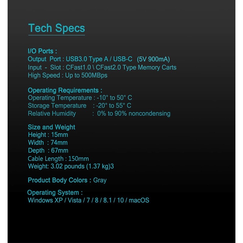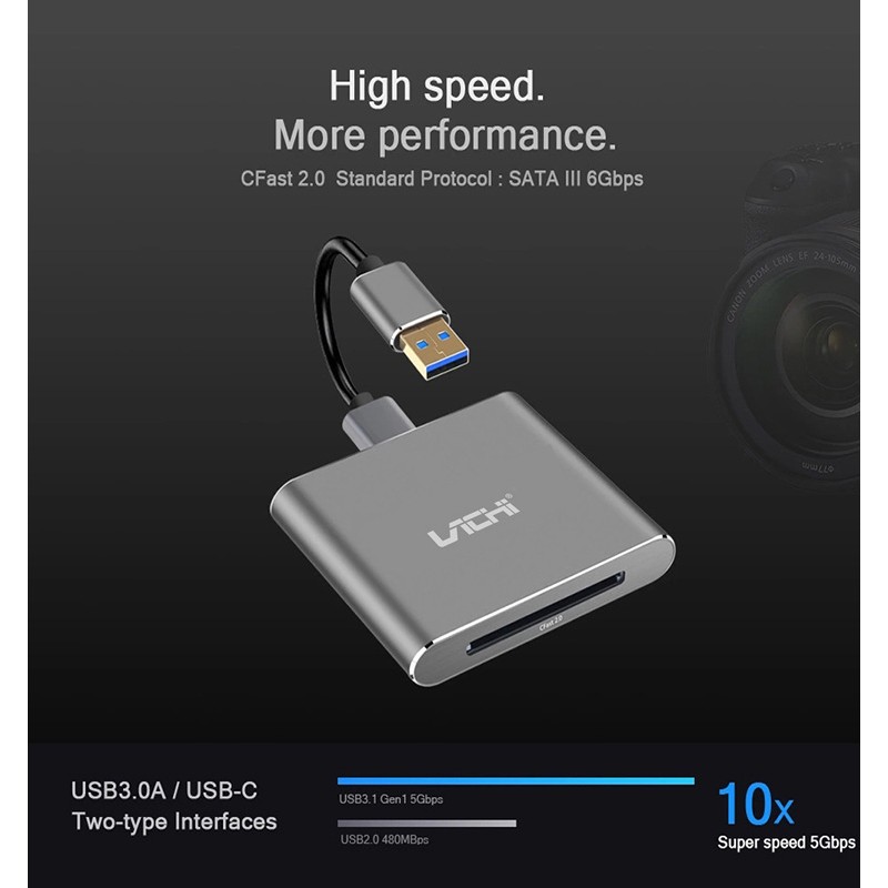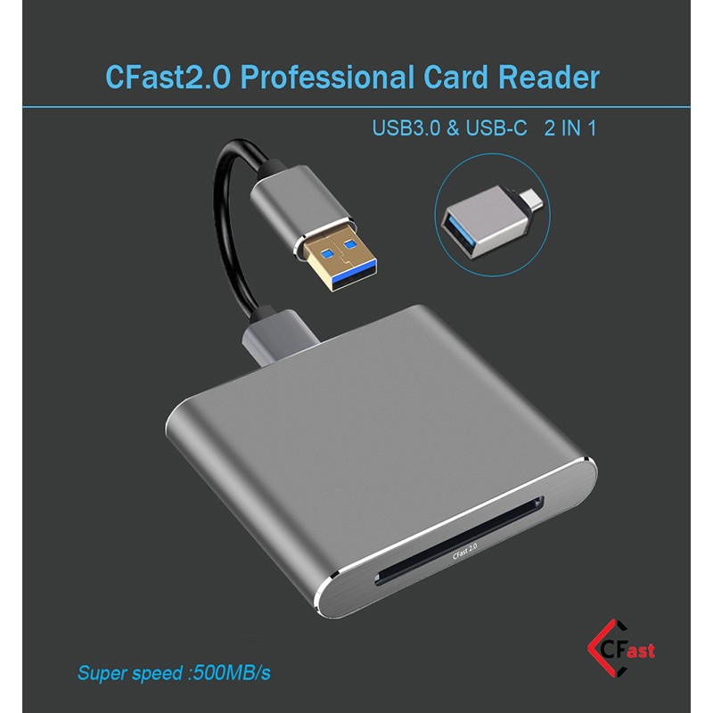 - 【CFast 2.0 Card Reader】Supports CFast 1.0 2.0 memory card data transfer. Transfer high-resolution images and video recordings to your computer faster and more efficiently, with fast USB 3.0 data transfer rate super-speed 5Gbps. The USB 3.0 is backward compatible USB 2.0 and USB 1.1.