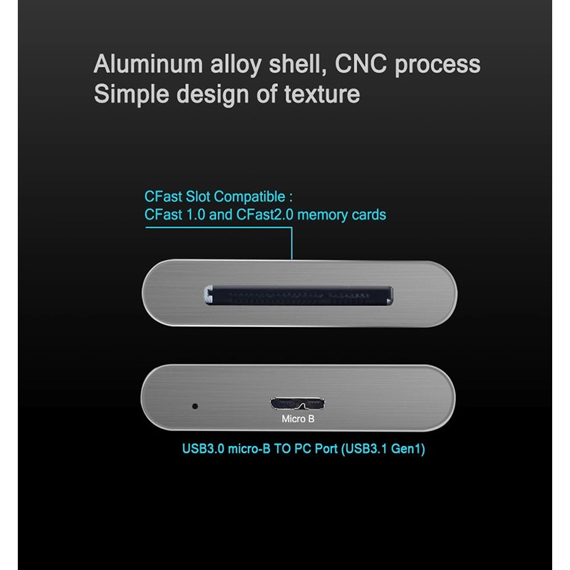 - 【Aluminum Compact Design】This USB C CFast Card Reader with a compact portable design could save space and easy take. The aluminum alloy cover makes the CFast reader more durable and high quality.