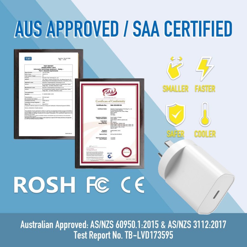 • 【Advanced Safety】: Elaso 20W USB-C wall charger has SAA, CE, FCC, and RoHS certifications and multiple protection systems. Design with over-current, over-voltage, over-heating, and short-circuit protection, exhaustive protection while charging, guard the safety of you and your devices. And it can intelligently identify the device and adjust the output.