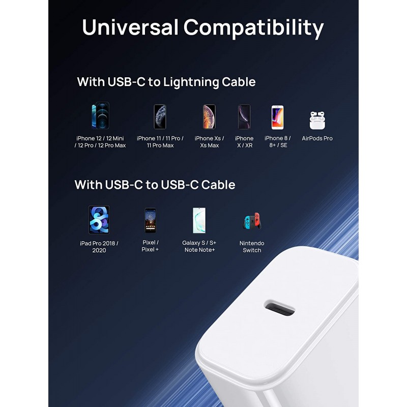 • 【Multiple Charging Protocols】20W USB-C Power Delivery Charger supports multiple fast charging protocols, including PD3.0, QC 3.0, AP2.4 and BC1.2. Compatible with most Type-C Android devices like Google Pixel, Samsung Galaxy, and LG etc.