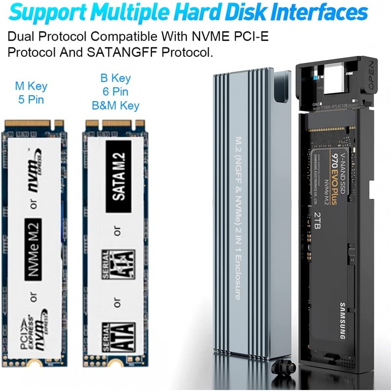 - Widely Compatibility: NVME SATA Enclosure compatible with Windows, Mac OS, Linux and Android. M.2 NVMe/SATA PCIe M key, PCIe B&M key SSD. NOT Compatible with M.2 PCIe AHCI SSDs, M.2 PCIe devices. You can snap in your NVMe or SATA drive and keep it in this enclosure and use it as a portable hard drive, for adding external data storage.