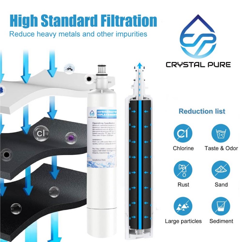 Experience filtration performance with the Crystal Pure refrigerator water filter replacement. Certified by the authoritative NSF and BPA Free. Crystal Pure exclusively employs 100% premium coconut shell carbon blocks to enhance taste and eliminate odors. It excels at removing chemicals and contaminants from your drinking water, ensuring a refreshing and clean taste.