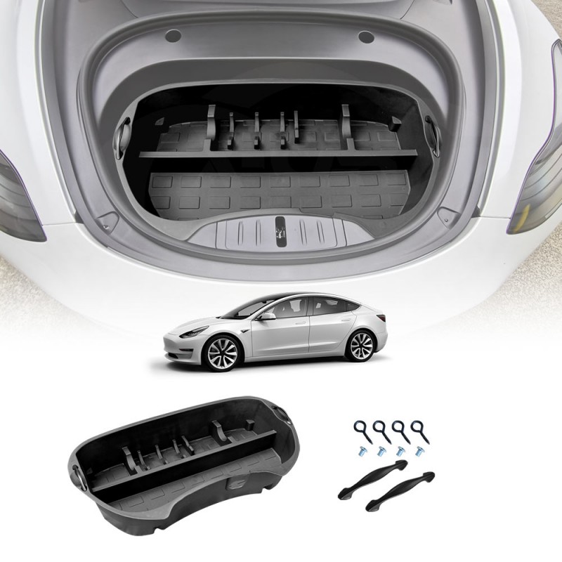 - Fitment: The Tesla Model 3 Front trunk organizer storage box fits for Tesla Model 3 2017-2023. It is designed according to the original vehicle. Coming with 4 separate spaces, specifically for the Model 3 for storing the necessary items carried with the car. Keep your car super-organized. Best Tool Box For Your Model 3 accessories.