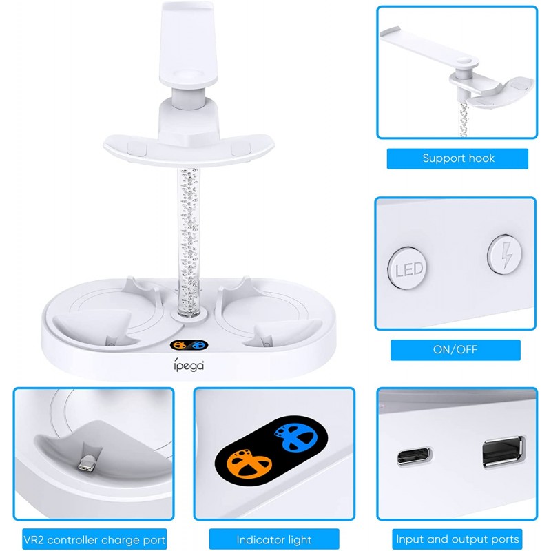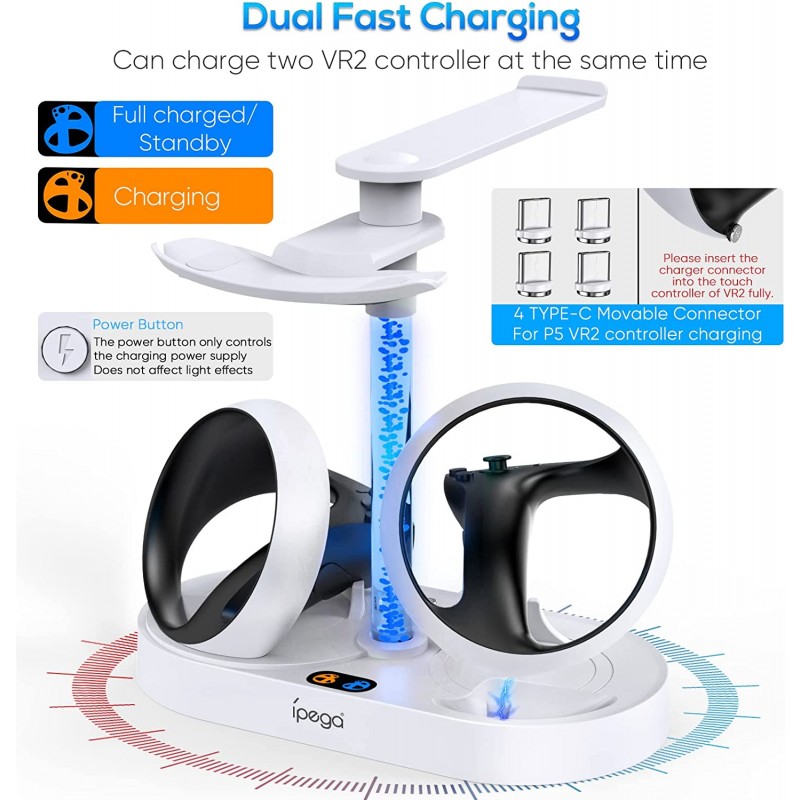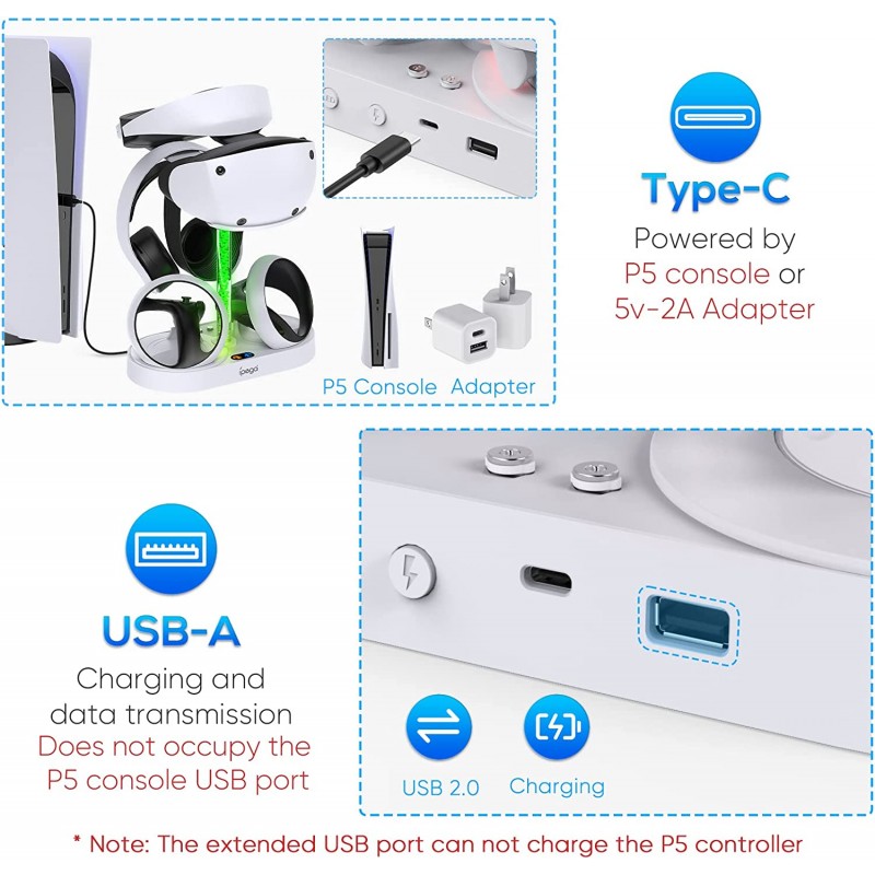 - 9 Dynamic RGB Lighting Modes-- This PS VR2 charging station is equipped with ambient atmosphere lights to give you a fantastic charging and gaming experience. With 7 color variations of Red, Green, Blue, Yellow, Cyan, Purple, White, creating a fantastic sense of technology to your PS VR2 charging dock station. (Note: Switch modes by short pressing, long press for 3s will close and save the present light).