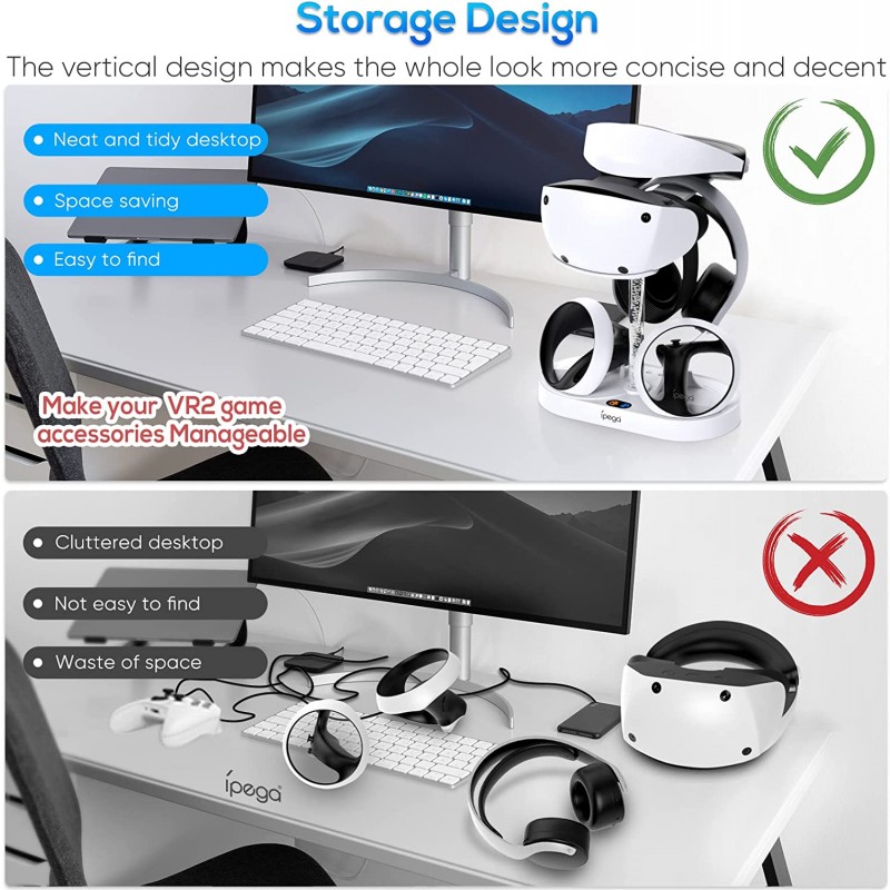 - 【Space-Saving & Organized】-- The PS5 VR2 stand adopts a vertical and more compact design, which minimizes the space occupied by the accessories, helps to put your VR headset and VR2 controller in same place, plays an excellent storage and display effect, allowing you prevent your VR kits damage, keep your gaming area clean and organized at all times.